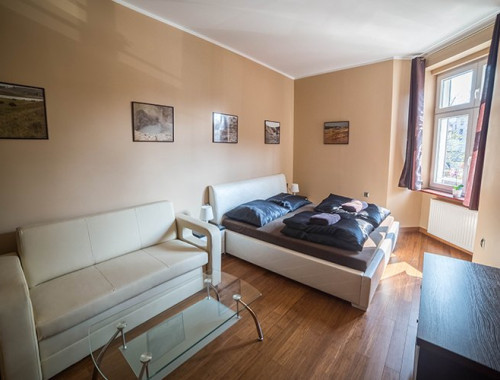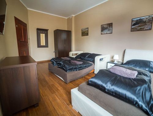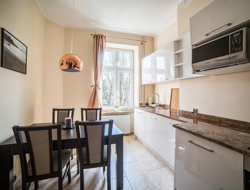 Lejligheden er på 100 m2 og ligger i centrum af Stettin i et af de bedste kvarterer. Lejligheden er total nyrenoveret og indeholder køkken med alt udstyr, moderne badeværelse samt 3 store soveværelser/suites til 4 personer, som hver har egen opholdstue med Smart TV. Stort fælles køkken. Der er dyner, sengetøj og håndklæder til 12 personer. Der er desuden Smart TV og internet applikationer, herunder YouTube og DVD-afspiller med masser af film på engelsk, dansk, norsk og enkelte på tysk, fransk, italiensk og spansk samt undertekster på forskellige sprog. Der er også trådløs Internet adgang.